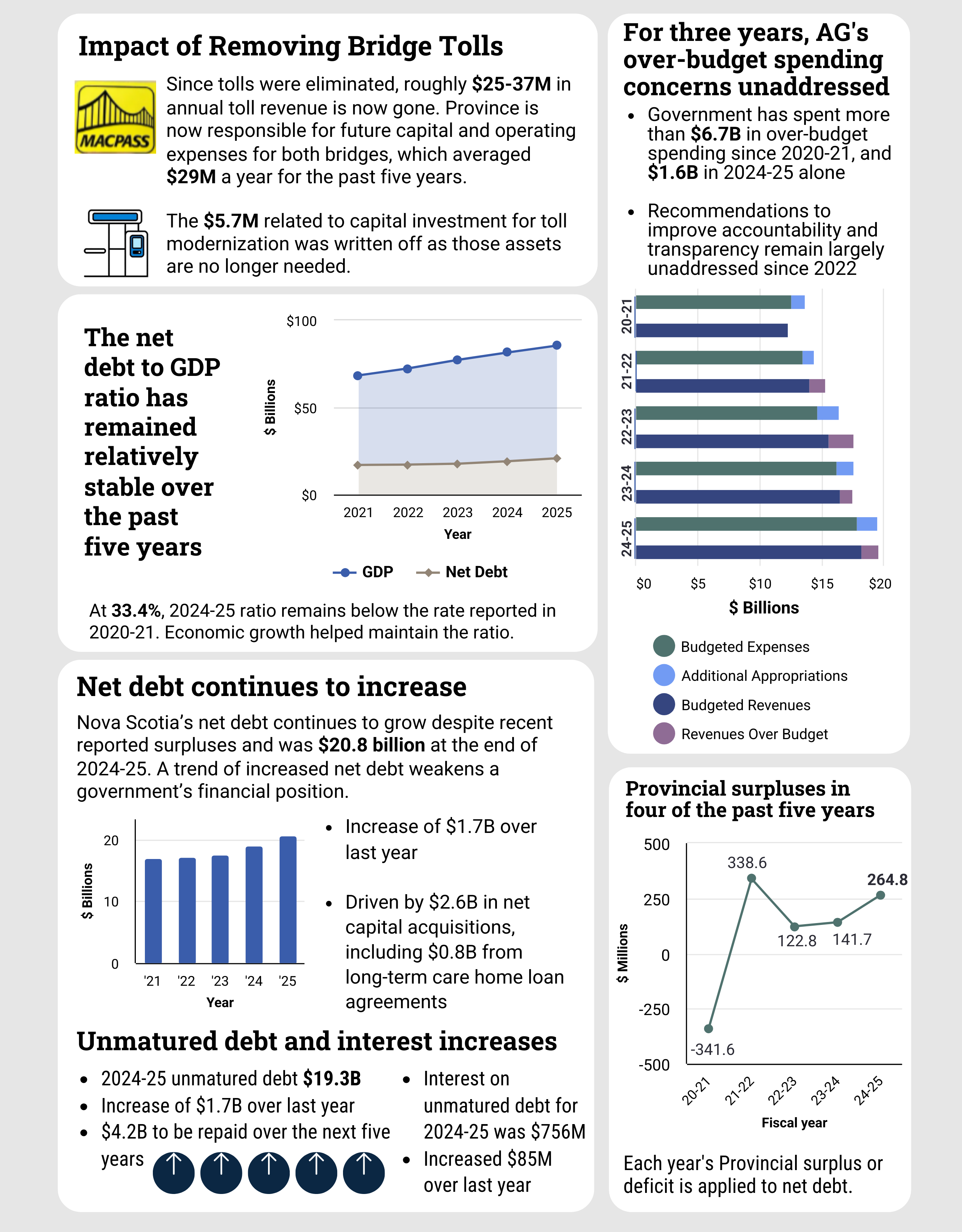 Nova Scotia Auditor General Kim Adair released her January 13, 2026 Financial Report to the House of Assembly. The report provides information on the audit of the March 31, 2025 Consolidated Financial Statements of the Province of Nova Scotia, as well as the results from audits of government organizations, information on the Province of Nova Scotia’s financial condition, and additional insights on important financial matters impacting the Province.