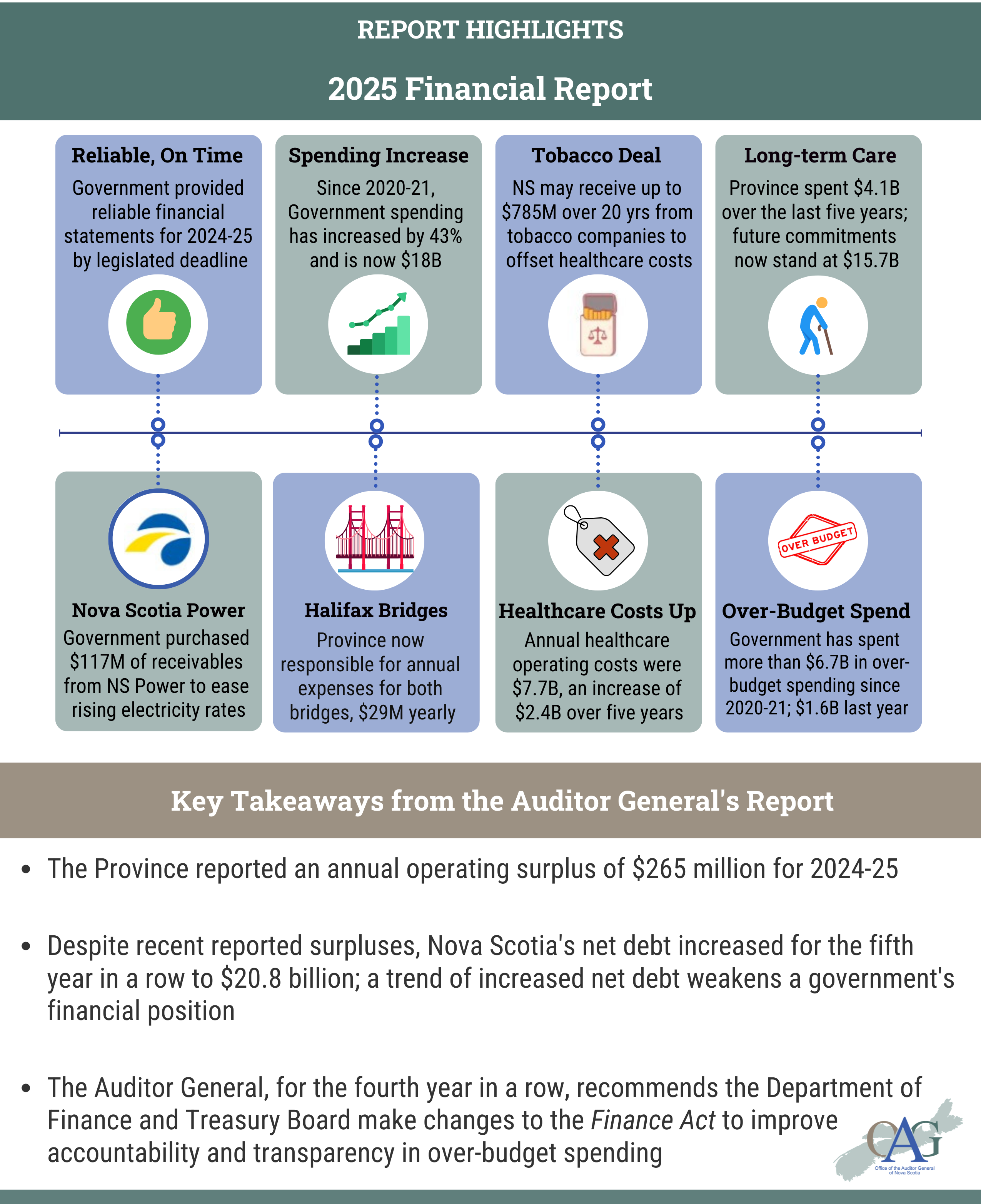 Nova Scotia Auditor General Kim Adair released her January 13, 2026 Financial Report to the House of Assembly. The report provides information on the audit of the March 31, 2025 Consolidated Financial Statements of the Province of Nova Scotia, as well as the results from audits of government organizations, information on the Province of Nova Scotia’s financial condition, and additional insights on important financial matters impacting the Province.