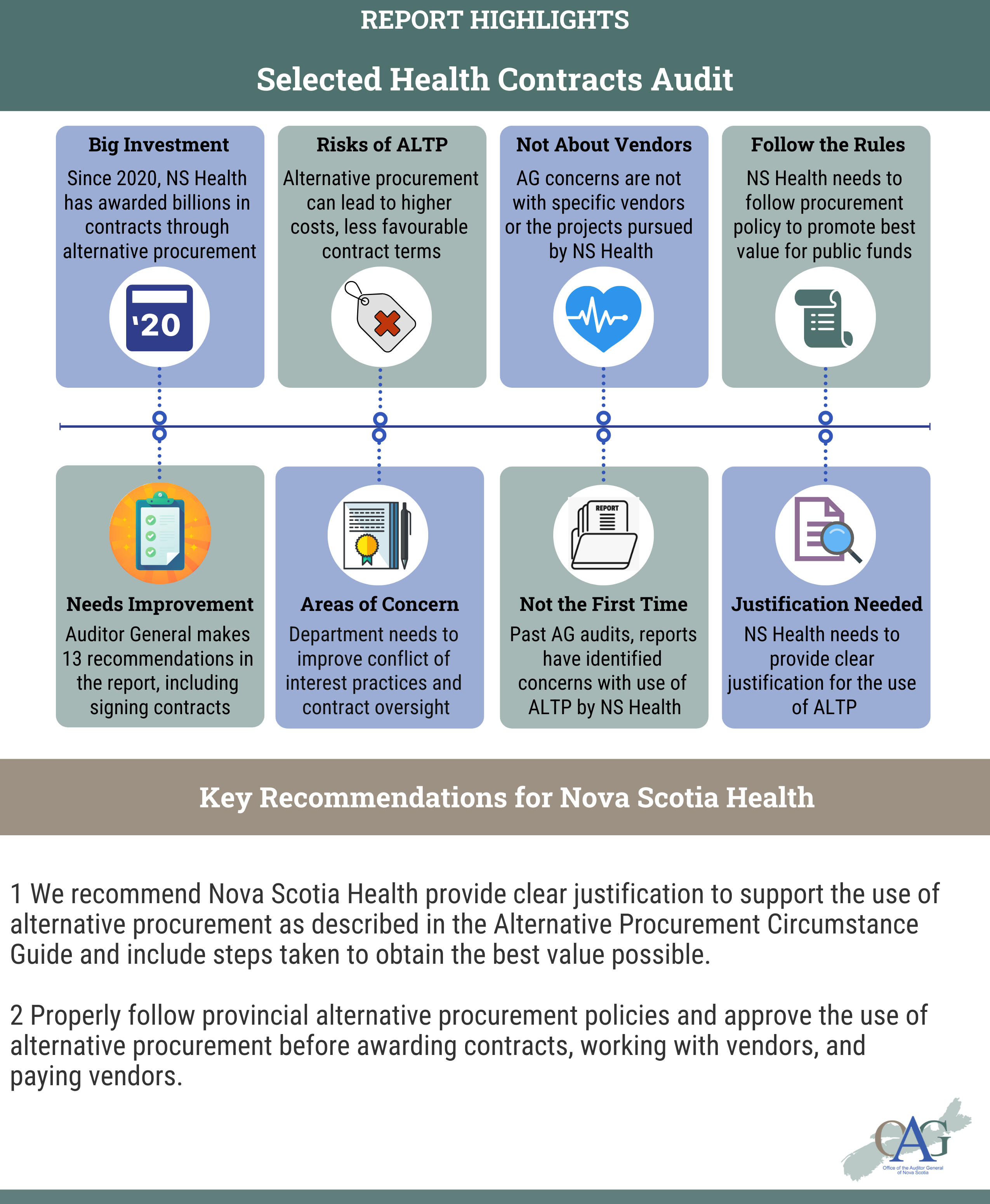 Nova Scotia Auditor General Kim Adair released her March 31, 2026 Report to the House of Assembly. This audit examined if Nova Scotia Health is effectively procuring and managing selected health contracts.